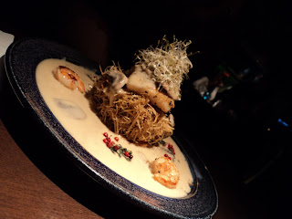 Para começar a parte food fomos com a seguinte entrada: Atum na crosta de gergelim e pimenta da aroeira com mandioquinha e cebola confitada. O prato veio tão lindo e apetitoso, que ataquei antes da foto, desculpem! Vai a foto "atacada" mesmo, mas da pra ter uma ideia.