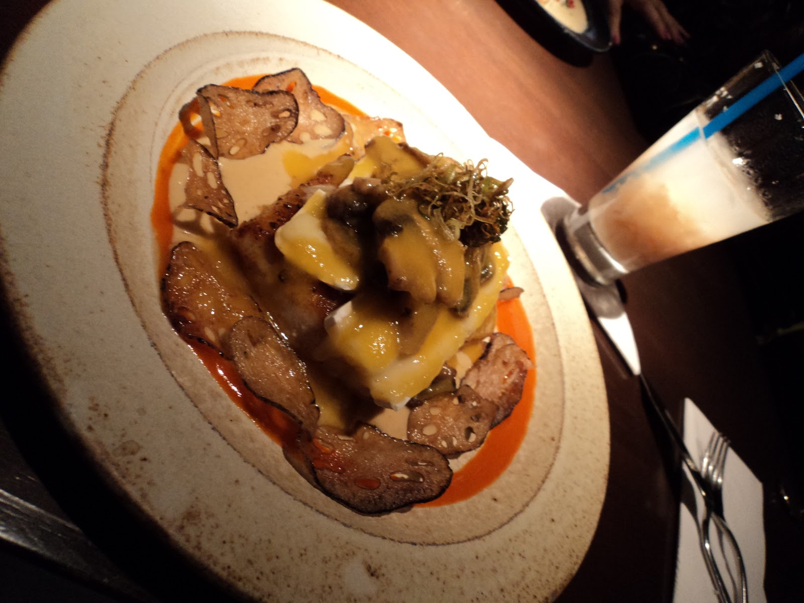 Eu fui de Robalo recheado com brie e cogumelo paris ao molho de damascos e chipz de raiz de lotus, que também estava uma delícia. Detalhe na foto para a minha Sakeroska que não fiz uma foto só dela.