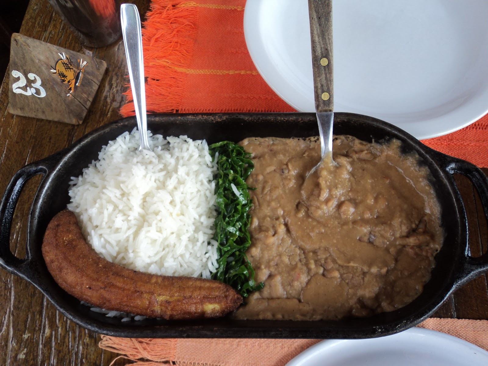 O minhão que serve duas pessoas vem acompanhado de: tutu, arroi, covi, ovu, banana i linguiça.